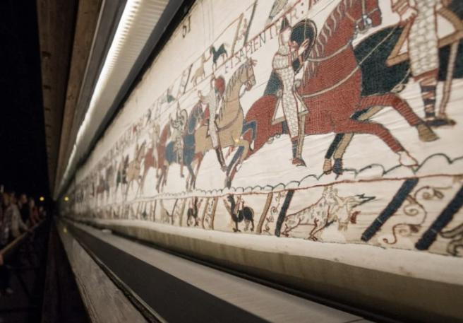“巴约挂毯”长约70米,高约50厘米,以中世纪连环画的形式,生动记录了1066年法国诺曼公爵威廉一世征服英国、加冕英格兰国王的历史,具有极高的艺术价值和史料价值。这张挂毯以刺绣的方式呈现了史料中的重要场面、人物和武器器具,历经数百年仍清晰可辨。“巴约挂毯”现藏于法国巴约挂毯博物馆中,是当地最有名的古代文物。据法国新闻台报道,历史上“巴约挂毯”仅有2次外借,第一次是1803年应拿破仑要求在巴黎展出,第二次是1945年在卢浮宫展出。